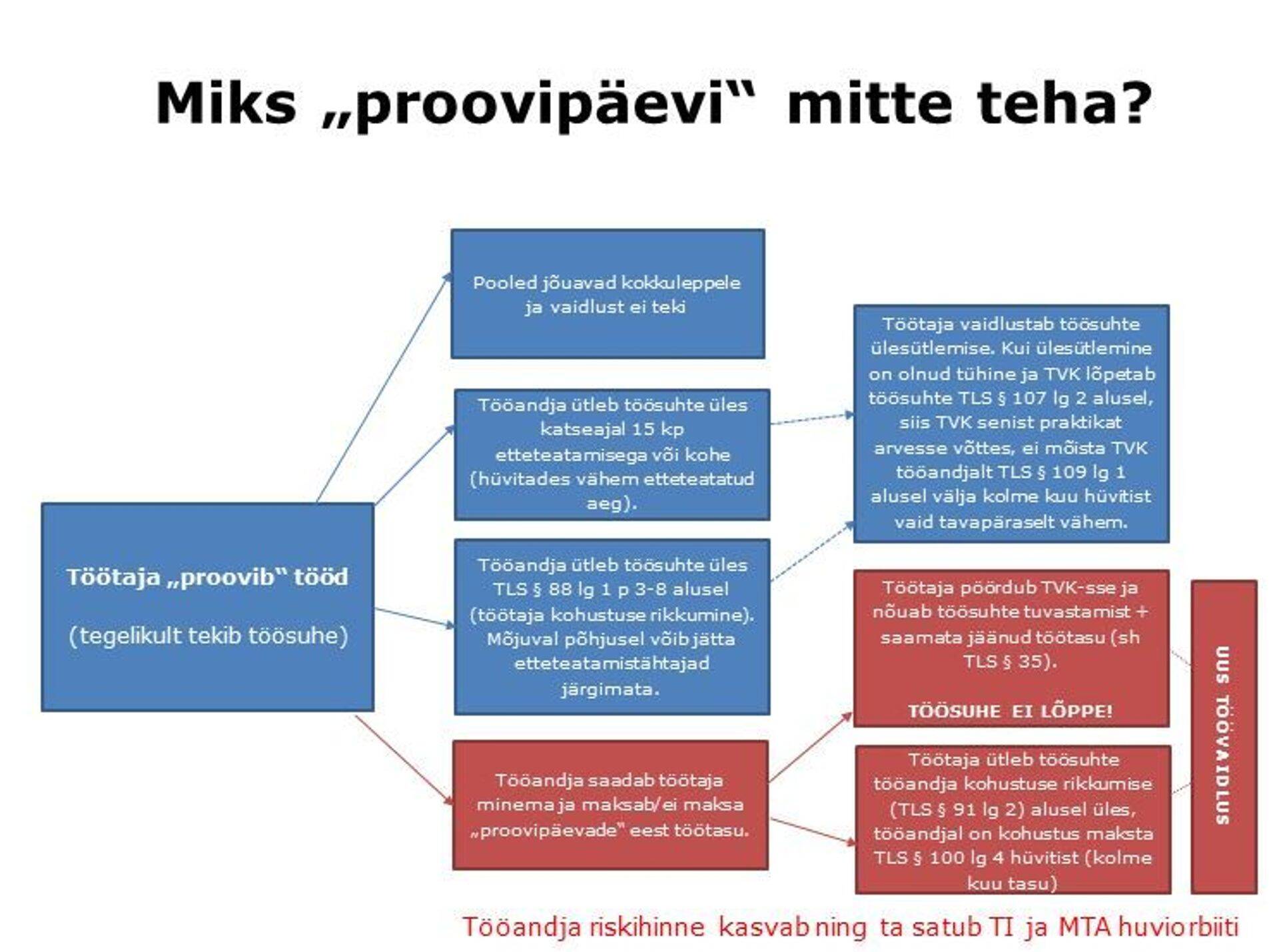 Lisaks praktikale tekitab jätkuvalt probleeme ka proovipäev. „Töötukassal on töötutele proovipäeva teenus, muid proovipäevi õigusaktid ette ei näe. Proovipäeva puhul võib olla tegu teenusepakkumisega, mis tuleb selgelt vormistada kokkuleppena. Samuti ei tohi proovipäeval klientide jaoks väärtusi luua ega tööülesandeid täita,” rõhutas Miidla-Vanatalu. Proovipäev võib olla siiski vaid töö vaatlemine või tööturuteenus.