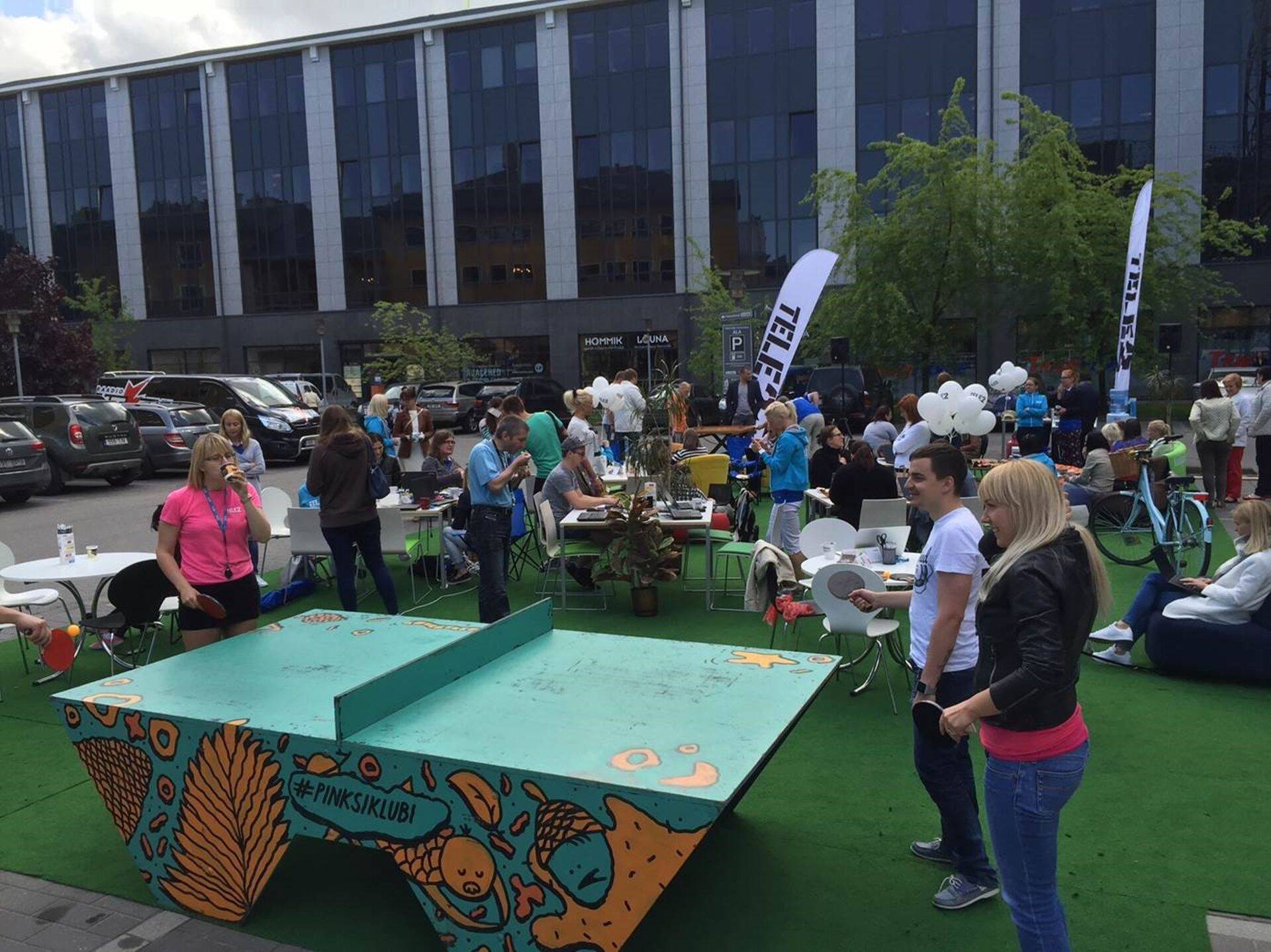 Tele2 kolis täna kell 12 pea kogu kontori välja muruplatsile (kesklinnas Jõe tn 2 hoovis): parkimisplatsi asemele rulliti muru ja rajatakse pop-up-kontor, mis sisaldab kõiki tavakontori elemente, ja sada inimest teeb reaalselt päevatööd. Väljas on lauad-toolid, printerid, kohvimasinad, taimed ja nõupidamisteruumid, meelelahutuseks pinks, koroona ja minigolf. Tööle tuldi rattaga ja kaasa võeti ka lemmikloomad.