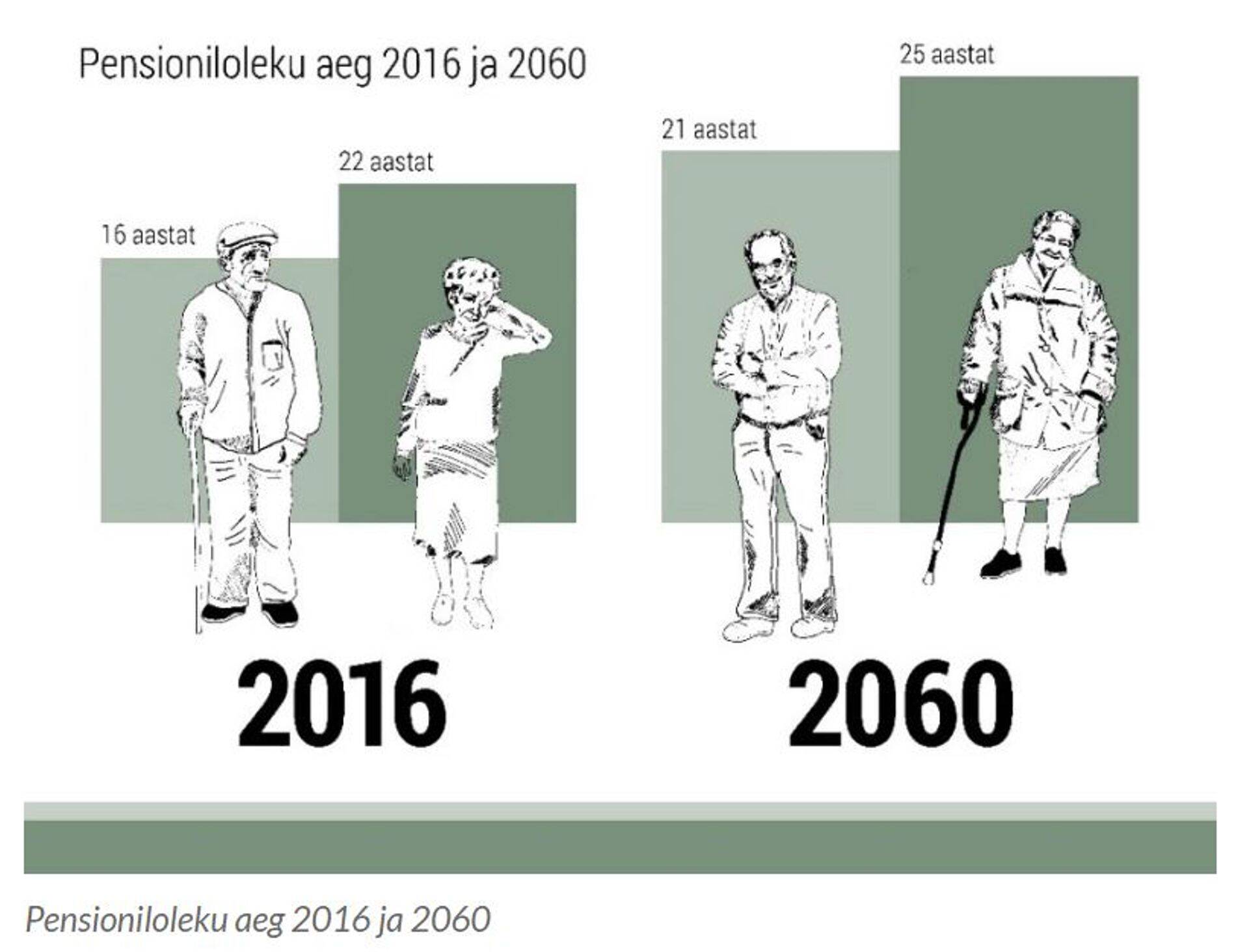 Eluea pikenemine teeb pensionipõlve väga pikaksLisaks sooduspensionäride varasele pensionile minemise võimalustele hakkab peagi ka üldine pensioniiga tulenevalt eluea pikenemisest madalaks jääma. Eesti meeste ja naiste pensioniiga on praegu 63 aastat ja see tõuseb alates 2017. aastast üheksa aasta jooksul 65-le. See võimaldab naistel olla pensionil keskmiselt 22 aastat ja meestel 16 aastat. Kui pärast 2026. aastat pensioniiga enam mitte tõsta, siis vastavalt oodatava eluea prognoosidele saavad naised aastal 2060 olla pensionil juba 25 aastat ja mehed 21 aastat.
