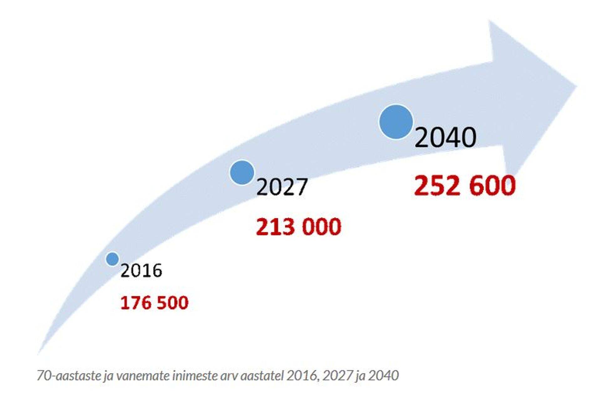 Seega, vastates pikemalt pealkirjas tõstatatud küsimusele: jah, elab küll, ja õnneks elab pensionieast oluliselt kauemgi. Juba praegu, 2016. aastal, elab Eestis 176 500 inimest, kes on vanemad kui 70 aastat. 67 000 neist on vanemad kui 80 aastat. Statistikaameti prognoosi järgi elab 2027. aastal Eestis 213 000 üle 70-aastast inimest ja 2040. aastal juba 252 600 üle 70-aastast inimest.